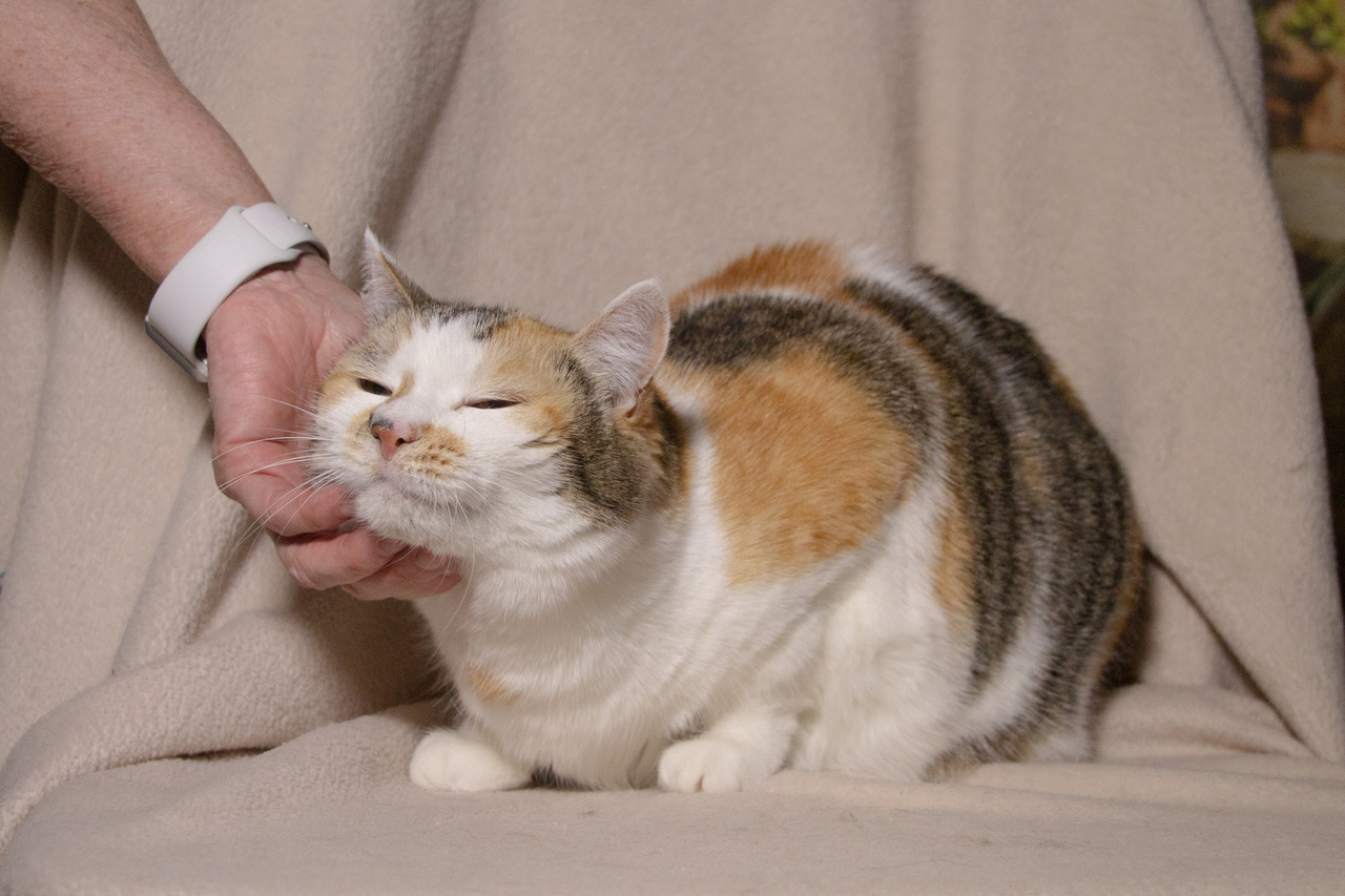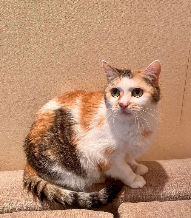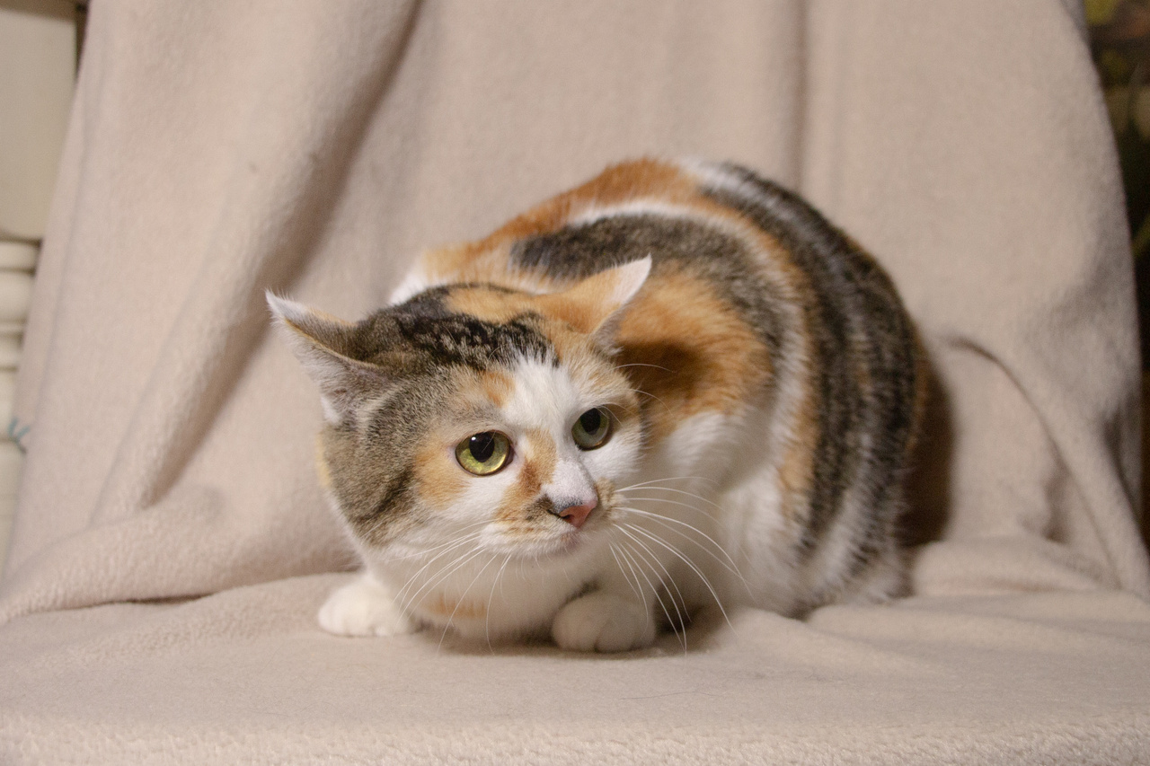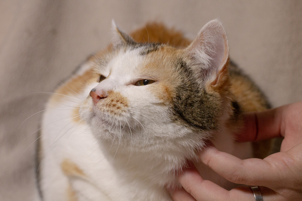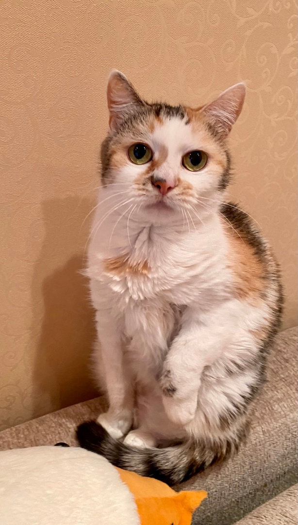 Взгляните на кошку Стешу. Правда, она – красотка? Эдакая кошачья мадам обворожительной наружности и приятной окружности. На мордашке Стеши – брызги от солнечных лучиков. Ее белую шубку украшают рыжие всполохи и тигровые полосы. Такая яркая трехцветная красота - редкость даже у кошек. Бытует мнение, что если у вас поселилась трехцветная кошка, то она непременно принесет в дом счастье и успех. А если такая красотка как Стеша, то ждите удачу на всех фронтах, включая финансовый.
