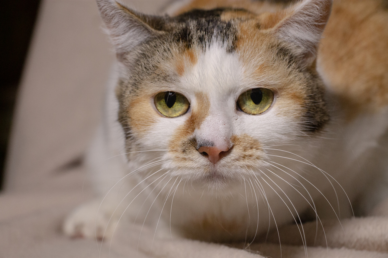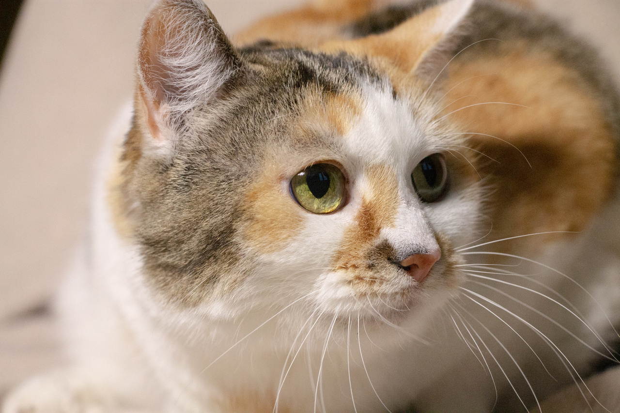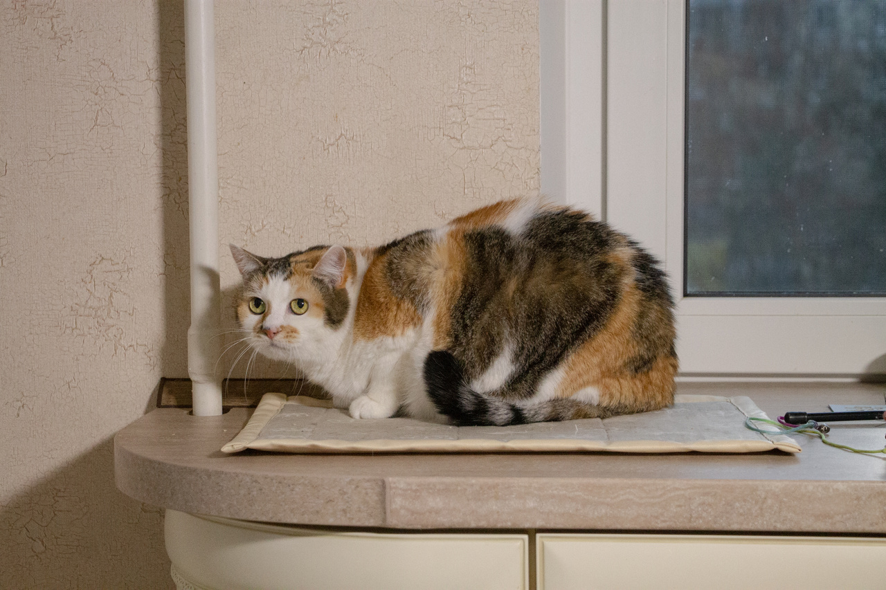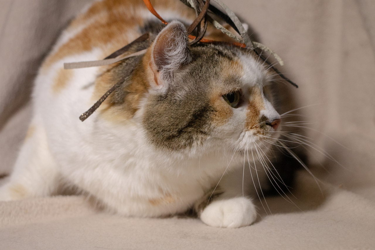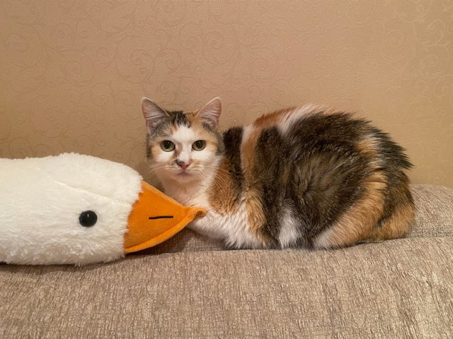 Взгляните на кошку Стешу. Правда, она – красотка? Эдакая кошачья мадам обворожительной наружности и приятной окружности. На мордашке Стеши – брызги от солнечных лучиков. Ее белую шубку украшают рыжие всполохи и тигровые полосы. Такая яркая трехцветная красота - редкость даже у кошек. Бытует мнение, что если у вас поселилась трехцветная кошка, то она непременно принесет в дом счастье и успех. А если такая красотка как Стеша, то ждите удачу на всех фронтах, включая финансовый.